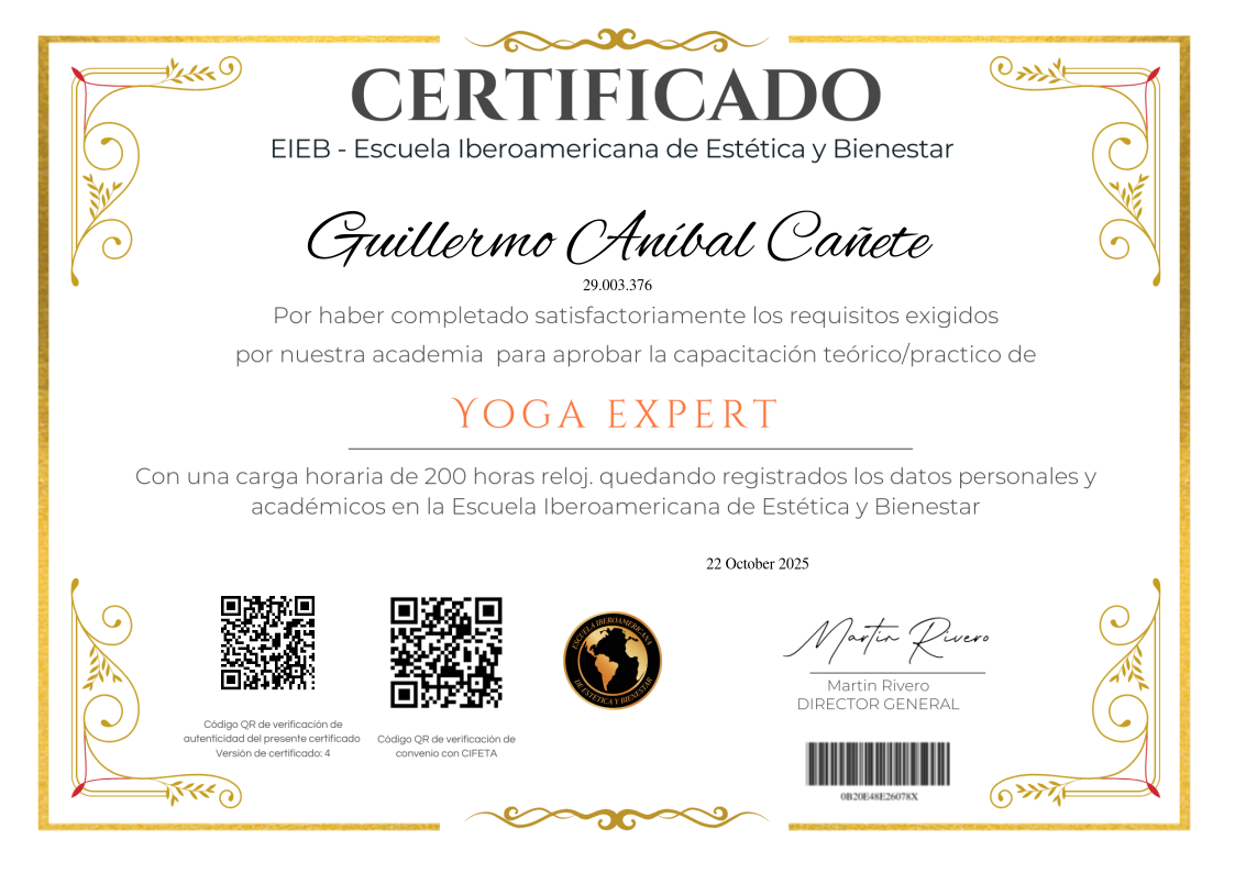 El presente certificado acredita la formación completa en el Curso de Yoga Expert, con una duración total de 200 horas académicas. Este programa ha sido diseñado para brindar una comprensión profunda y profesional del yoga, integrando conocimientos teóricos y prácticos orientados a mejorar la salud física, mental y emocional a través de la práctica consciente.