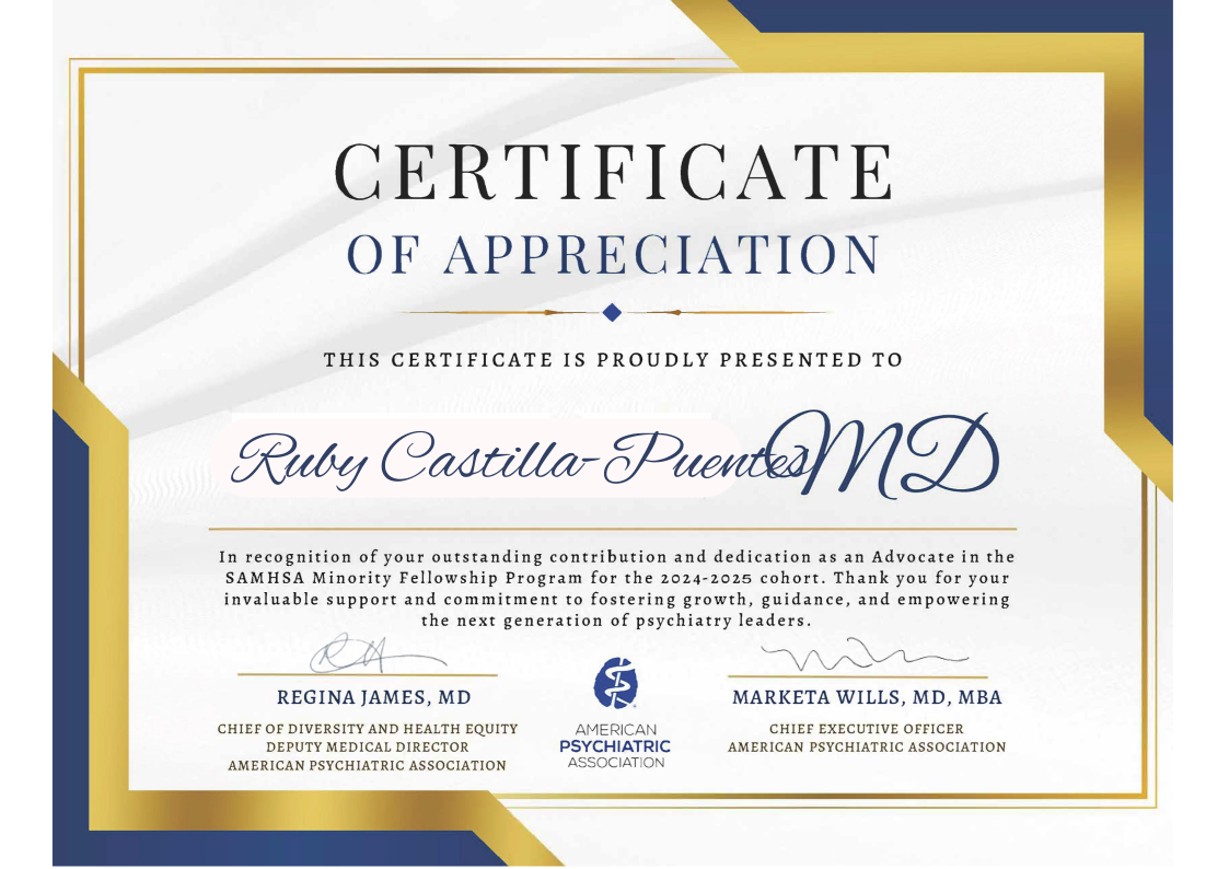 A certificate recognizing psychiatrists who have chosen to participate in the American Psychiatric Association's SAMHSA MFP Resident Fellowship's Advocate/Protege Program as an advocate for our fellows.