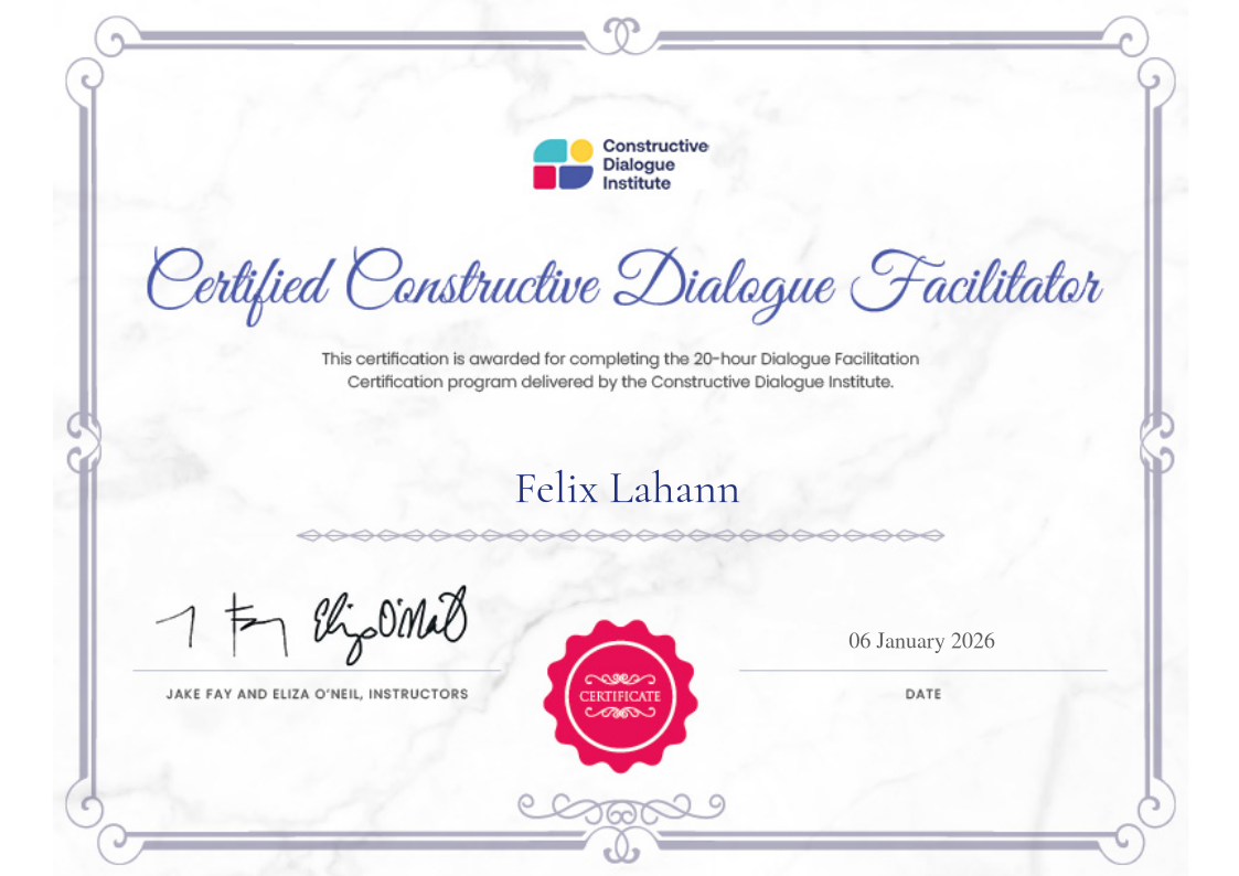 The person who has completed the Dialogue Facilitation Certification has received 20 hours of instruction, practice, and study surrounding dialogue facilitation. They have learned and practiced the skills of dialogue facilitation and are prepared to facilitate dialogue across lines of difference between students on their campus. The certification equipped them with a holistic understanding of the role of a dialogue facilitator, facilitation techniques, intervention strategies, and a framework for planning and running dialogue opportunities for students. The certification prepared them to facilitate dialogue across a range of contexts, including routine residential life programming, unexpected campus events, and interpersonal student conflicts.