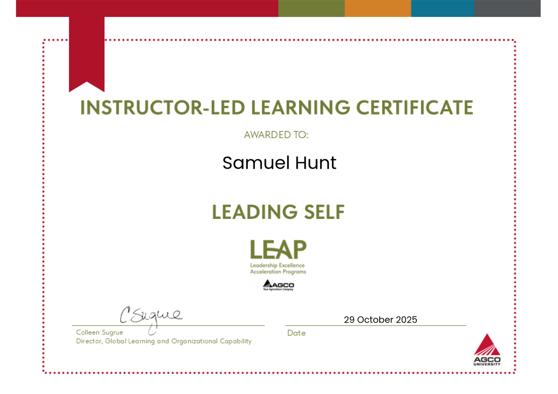 Instructor-led learning, whether virtual classroom or in-person classroom, is comprehensive and includes all DDI courses as well as some AGCO-designed courses. These courses are specifically tailored to develop all nine competencies outlined in the AGCO competency model. Employees can earn a certificate by enrolling in one targeted leader level curriculum and completing at least six classes.