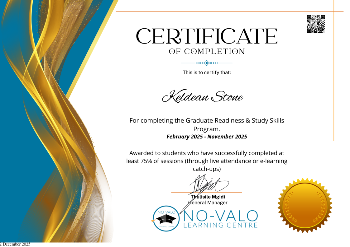 This accomplishment recognises the learner’s commitment to continuous improvement, adaptability, and proactive personal and career development — values at the heart of the No-Valo Learning Centre, where education extends beyond academics to inspire holistic growth and lifelong success.