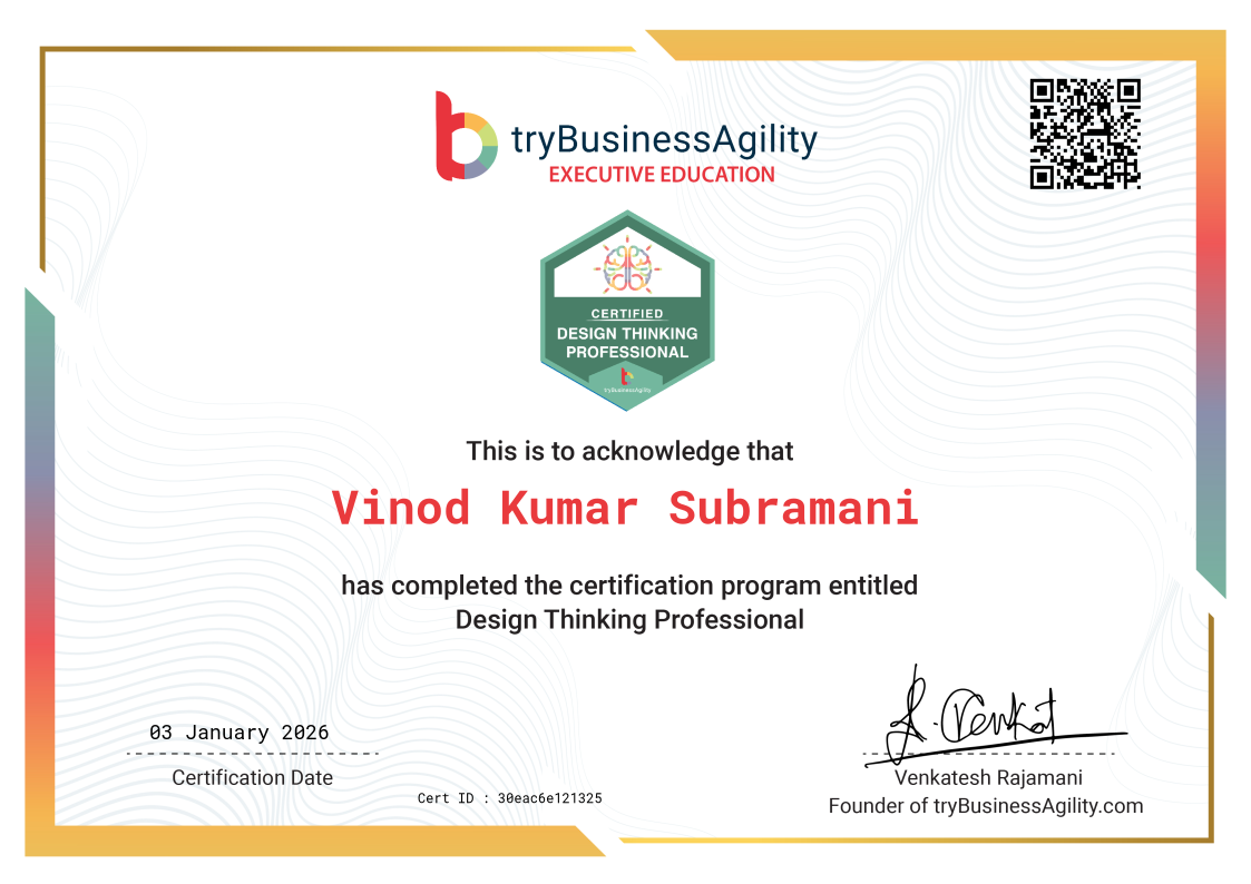 The individual successfully completed a one-day immersive design thinking training session, which equipped them with the skills to empathetically identify user needs, define challenges, ideate creative solutions, prototype, and test innovations to address complex product development problems effectively. This program fostered creativity and adaptability, empowering individuals to craft innovative solutions that address customer challenges with a human-centered approach to design.
