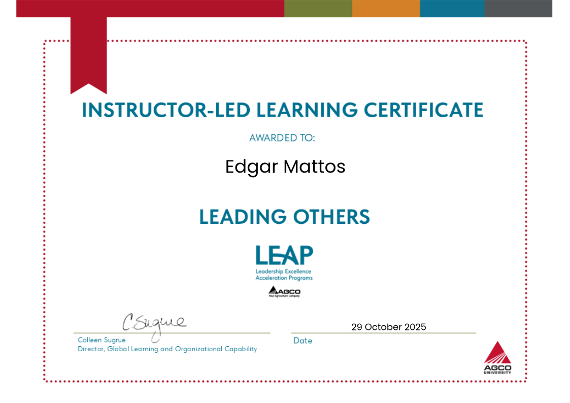 Instructor-led learning, whether virtual classroom or in-person classroom, is comprehensive and includes all DDI courses as well as some AGCO-designed courses. These courses are specifically tailored to develop all nine competencies outlined in the AGCO competency model. Employees can earn a certificate by enrolling in one targeted leader level curriculum and completing at least six classes.