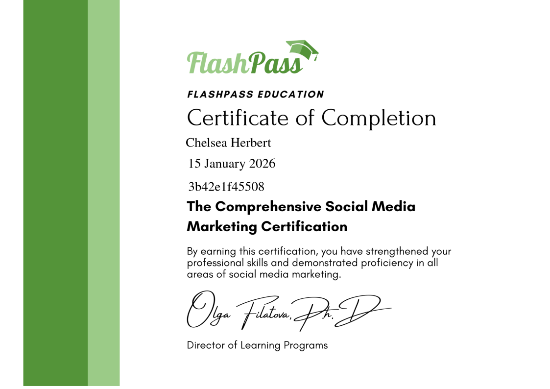 Certification that demonstrates the recipient's comprehensive understanding of organic and paid marketing methods on a variety of social media platforms.