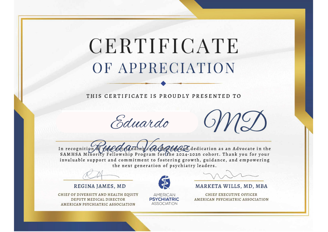 A certificate recognizing psychiatrists who have chosen to participate in the American Psychiatric Association's SAMHSA MFP Resident Fellowship's Advocate/Protege Program as an advocate for our fellows.