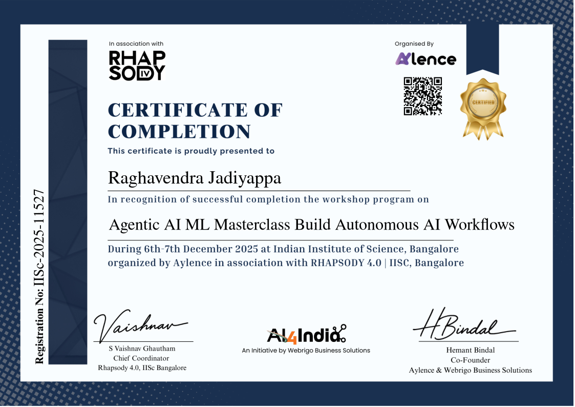 The workshop series is hosted in association with Rhapsody 4.0, IISc Bangalore. This workshop series is designed to foster deeper understanding and confident use of artificial intelligence (AI) and related technologies in professional environments. The goal is to transform participants from passive observers of ‘what’s possible’ to active practitioners who can harness AI to improve decisions, productivity and impact.