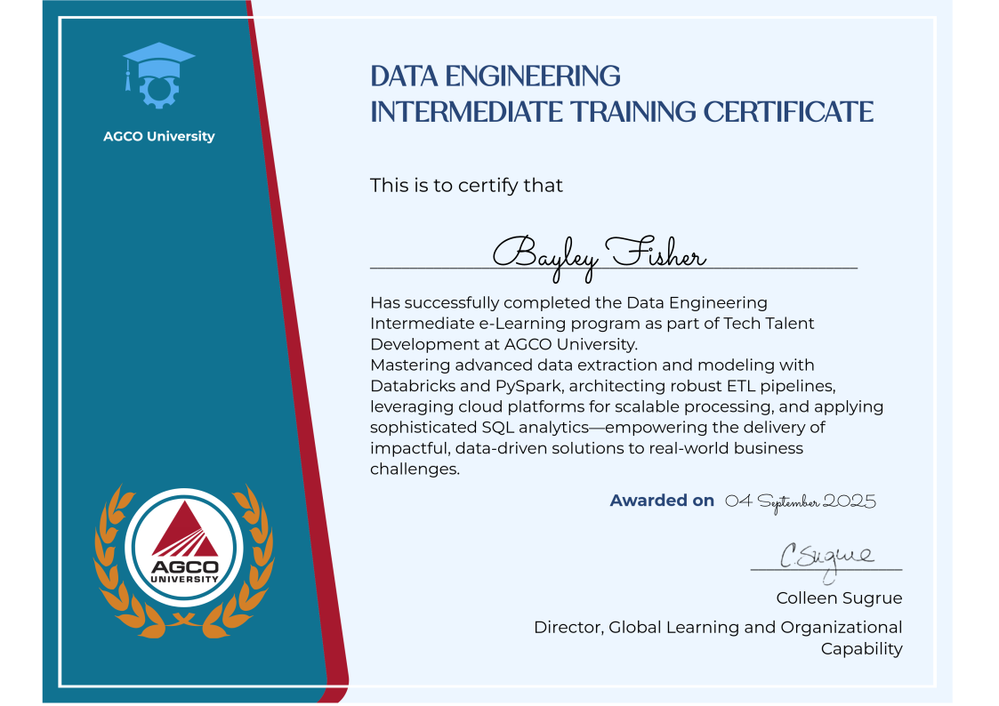 The Data Engineering Intermediate e-Learning program at AGCO University, part of the Tech Talent Development initiative, is designed for professionals ready to elevate their expertise in modern data engineering. This program bridges foundational knowledge with advanced, industry-relevant skills—empowering participants to architect, optimize, and apply data solutions that drive real business impact.