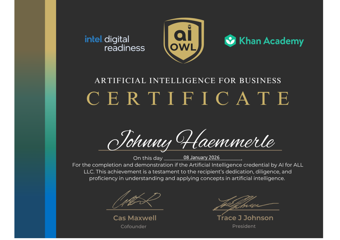 For the completion and demonstration of the Artificial Intelligence for Workplace Productivity credential by AI for ALL LLC (AI OWL). This achievement is a testament to the recipient’s dedication, diligence, and proficiency in understanding and applying concepts in Artificial Intelligence.