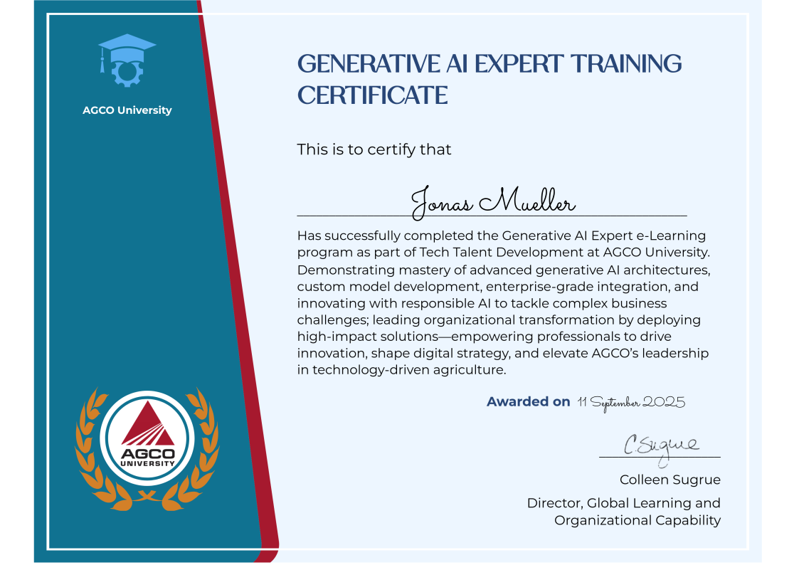 Learners develop expertise in custom model creation, advanced prompt engineering, and the integration of responsible AI practices. The curriculum is designed to empower graduates to drive digital transformation, deliver high-impact business solutions, and help position AGCO as an industry leader in technology-driven agriculture. Completion of this credential recognizes a commitment to continuous learning, innovation, and the highest standards of excellence in AI leadership.