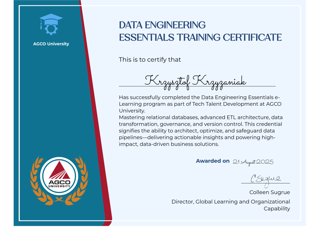 The Data Engineering Essentials e-Learning program at AGCO University is a cornerstone of our Tech Talent Development initiative, designed to empower professionals with the advanced skills needed to drive innovation and operational excellence in today’s data-centric world. This comprehensive program guides participants through the end-to-end data engineering lifecycle—from foundational concepts such as databases, dataframes, and ETL pipelines to hands-on mastery of the tools and techniques shaping modern data infrastructure.