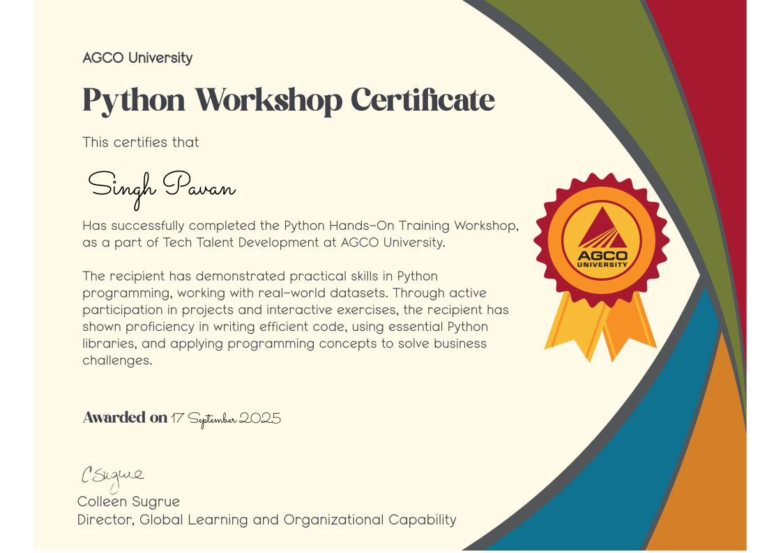 Upon successful completion, participants receive a credential that recognizes their commitment to professional growth and their ability to apply Python skills to advance AGCO’s mission of innovation and operational excellence.