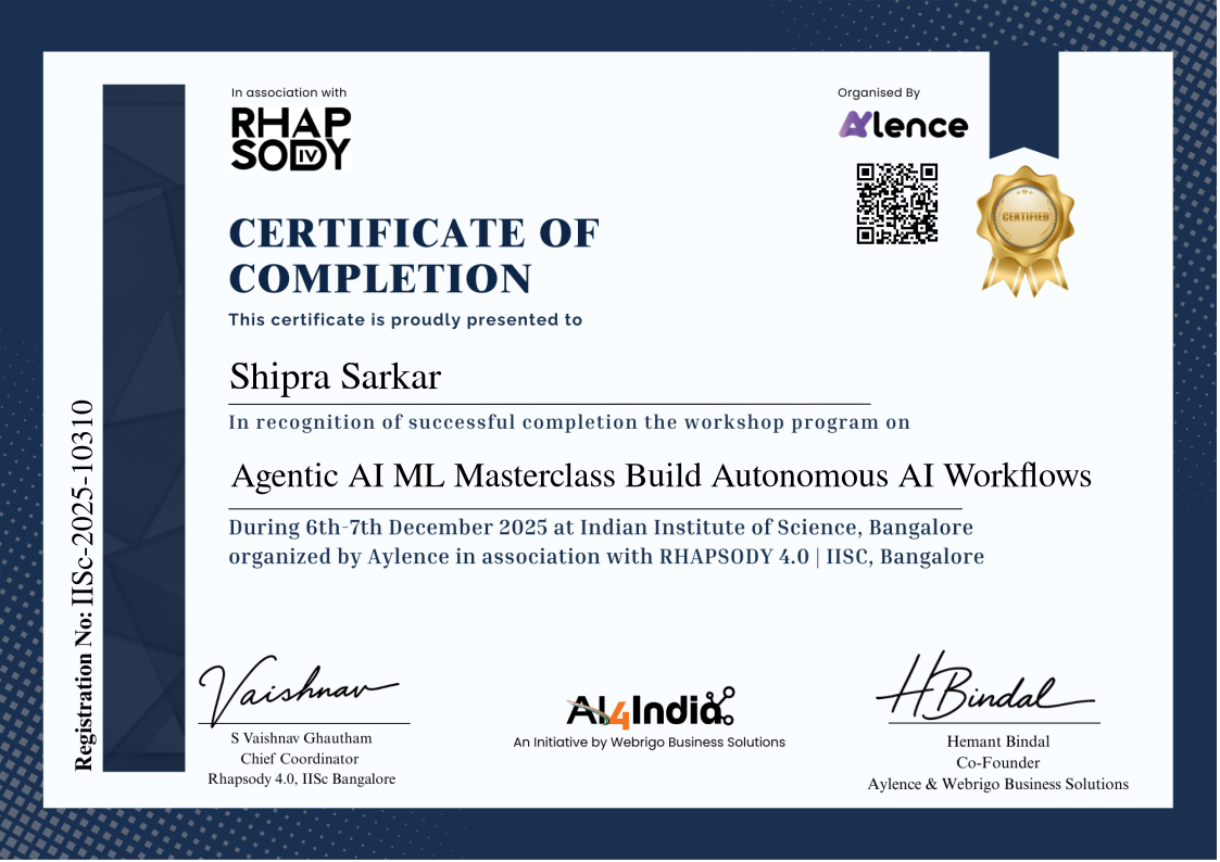 The workshop series is hosted in association with Rhapsody 4.0, IISc Bangalore. This workshop series is designed to foster deeper understanding and confident use of artificial intelligence (AI) and related technologies in professional environments. The goal is to transform participants from passive observers of ‘what’s possible’ to active practitioners who can harness AI to improve decisions, productivity and impact.