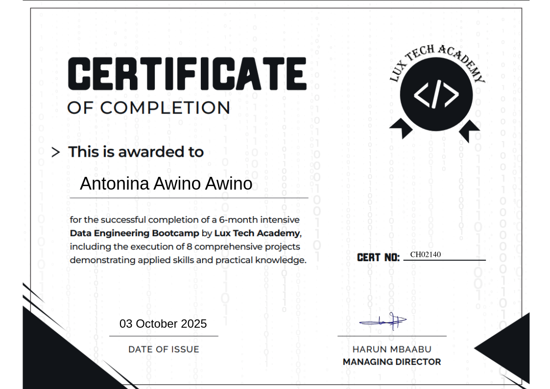 The LuxDevHQ Data Engineering Programme is an intensive 16-week, full-time training bootcamp designed to prepare participants for professional roles in data engineering. Hosted in Nairobi, Kenya, and led by LuxDevHQ, the programme is tailored to meet the growing demand for skilled data engineers in Africa and beyond. Structured with a clear weekly schedule, the programme runs from Monday to Saturday, combining theory, lab work, and peer-led collaboration. Learners receive in-depth training in Python, SQL, Apache Airflow, Kafka, Spark, AWS, Azure, and Delta Lake, with an emphasis on real-world application. Each week includes project-based learning, job shadowing with experienced engineers, and mini-projects designed to simulate industry challenges.