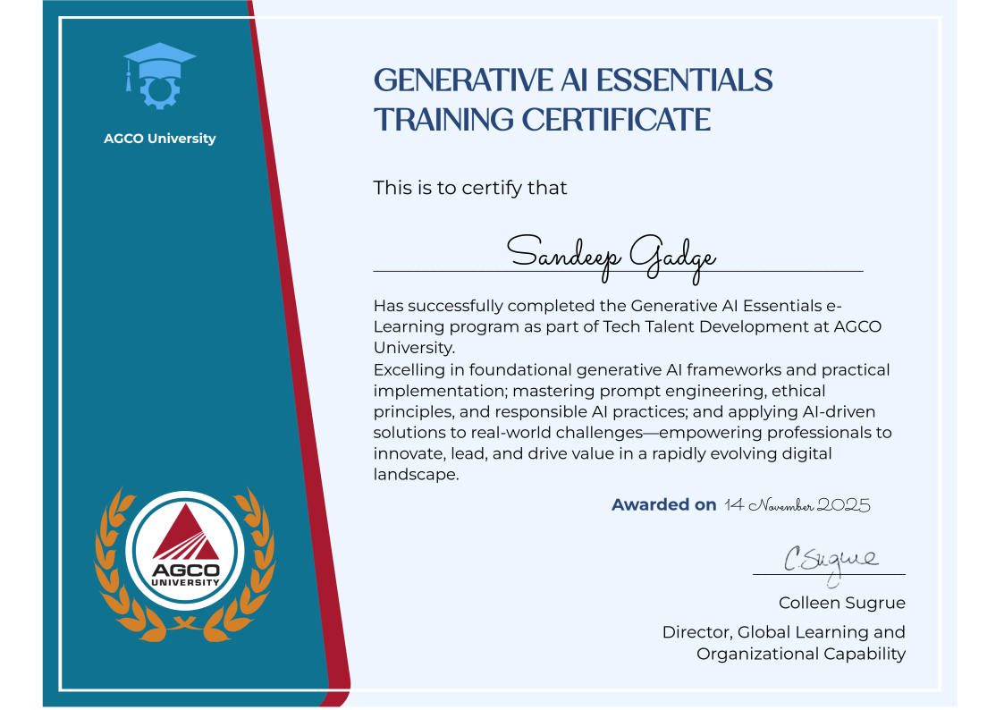 Completion of this credential demonstrates readiness to drive digital transformation, lead change, and contribute to AGCO’s vision of creating an exceptional employee experience and fueling organizational growth. Graduates are equipped to apply generative AI solutions that enhance efficiency, deliver customer value, and position AGCO as a leader in sustainable, technology-driven agriculture.