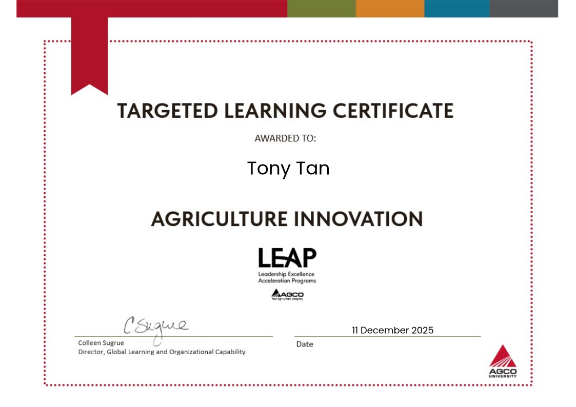 LEAP: Agriculture Innovation is an 8-10 month leadership development program where participants tackle real AGCO business challenges while building leadership skills. Using Design Thinking, diverse teams collaborate on hands-on projects through three phases, blending online learning and practical problem-solving to deliver actionable business solutions.