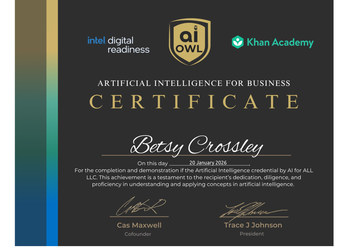 For the completion and demonstration of the Artificial Intelligence for Workplace Productivity credential by AI for ALL LLC (AI OWL). This achievement is a testament to the recipient’s dedication, diligence, and proficiency in understanding and applying concepts in Artificial Intelligence.
